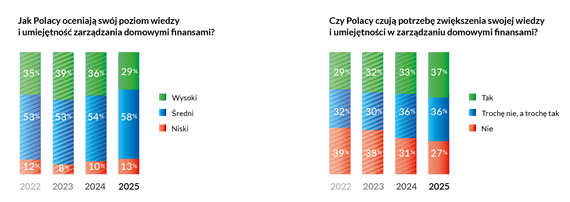 Od 2022 roku utrzymuje się trend dotyczący większej potrzeby związanej z poszerzeniem swojej wiedzy i umiejętności finansowych. Tylko w skali roku o 4 p.p. wzrósł odsetek Polaków, którzy czują potrzebę poszerzenia swojej wiedzy ekonomicznej. Widoczny jest też spadek o 4 p.p. odsetka osób, które uważają, że ich wiedza jest wystarczająca.