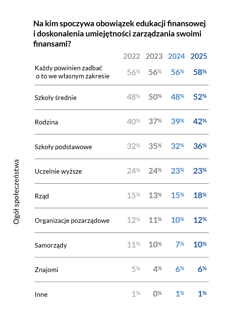 Szkoły średnie i podstawowe są uznawane za ważne źródła edukacji finansowej, szczególnie przez osoby bez zaległości. Z kolei wśród osób zadłużonych rośnie przekonanie, że rodzina powinna odgrywać większą rolę w edukacji finansowej. Może to wynikać z potrzeby bardziej bezpośredniego i praktycznego wsparcia.