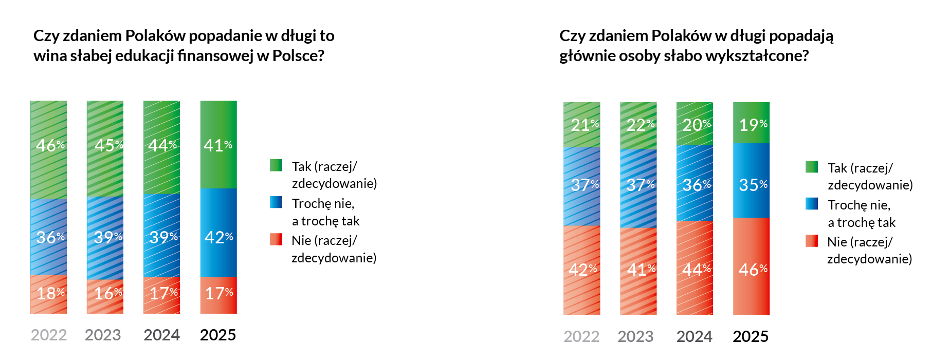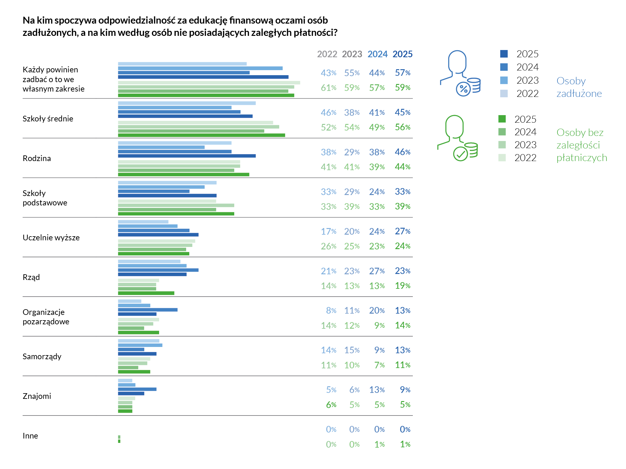 Osoby zadłużone częściej niż osoby bez zaległości wskazują rząd, samorządy i organizacje pozarządowe jako podmioty odpowiedzialne za edukację finansową. Może to świadczyć o oczekiwaniu większego wsparcia systemowego w sytuacjach trudnych finansowo. Niezmiennie zarówno osoby zadłużone, jak i osoby bez zaległości płatniczych najczęściej wskazują, że edukacja finansowa powinna być indywidualną odpowiedzialnością. Choć osoby bez zadłużenia są w tym bardziej konsekwentne, osoby zadłużone również coraz częściej podzielają tę opinię.